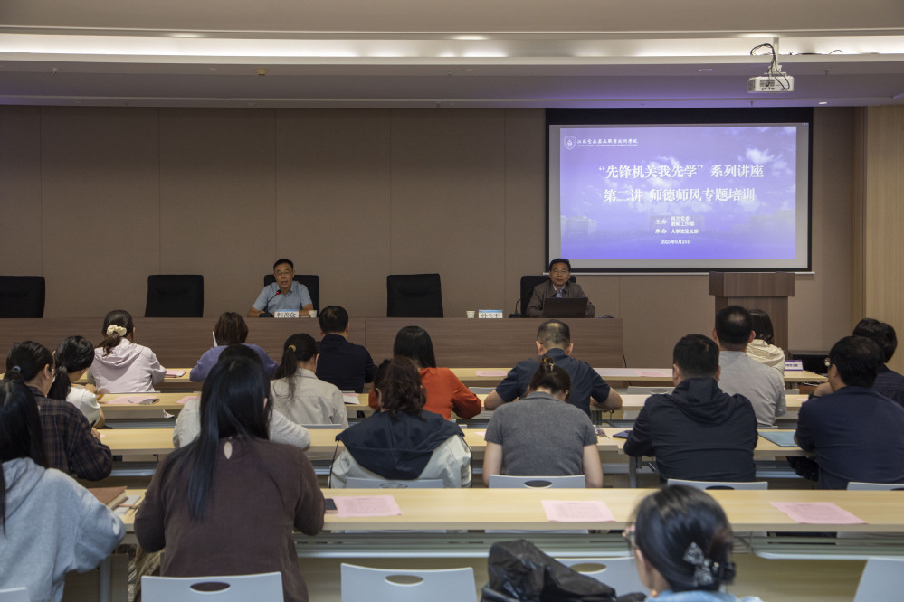 9月24日下午,由机关党委、教师工作部共同主办,人事处党支部承办的师德师风活动月专题培训--“先锋机关我先学”系列讲座第二讲在图书馆五楼党校顺利举行。本次讲座特别邀请淮阴工学院孙全平教授为机关全体党员带来“加强师德师风建设与高校行政管理人员担当”专题讲座。人事处党支部书记、人事处处长韩善仓主持,机关全体党员参加培训。